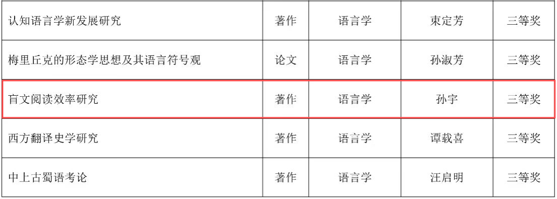 近日,教育部公布了第九屆高等學(xué)校科學(xué)研究?jī)?yōu)秀成果獎(jiǎng)(人文社會(huì)科學(xué))獲獎(jiǎng)成果名單,我校特殊教育學(xué)院孫宇教授的著作《盲文閱讀效率研究》榮獲著作論文獎(jiǎng)三等獎(jiǎng)。這是我校獲教育部高等學(xué)校科學(xué)研究?jī)?yōu)秀成果獎(jiǎng)(人文社會(huì)科學(xué))的新突破。